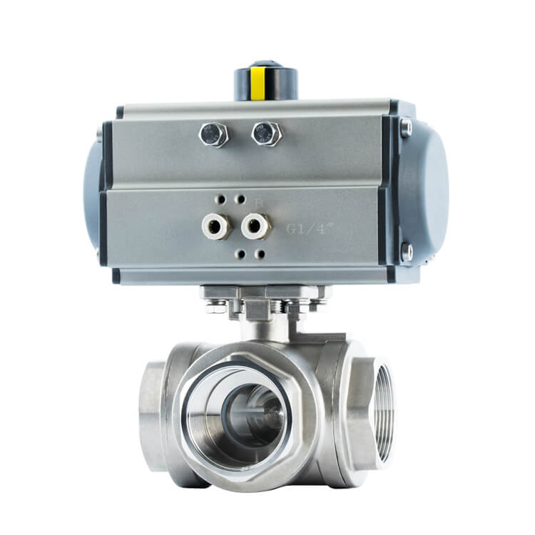304 316 3 way pneumatic ball valve is divided into L port pneumatic 3 way ball valve and T port pneumatic 3 way ball valve.Pneumatic L port 3 way ball valve is used for the direction switch of medium flow, enabling two channels that are vertical to each other connect.The Pneumatic T port 3 way ball valve is used for diversion,convergence and flow direction switch of medium.304 316 3 way pneumatic ball valve is widely used in water supply,petrochemical,metallurgy,mining,textile,energy, papermaking,food,steel and other pipeline systems to switch the flow direction of the medium and to divert or converge.